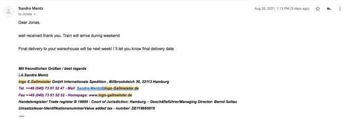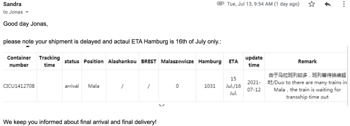 Currently, we have shipped 2200 Rewards are shipped. Taking us to about 30% of the total contributions. We have 1500 grey on the way in next week for DK (which will take us to about 50% shipped). It’s been delayed due to massive congestion in Russia. Should have been in on the 8th now arriving on the 25th In Hamburg and then going to Denmark… Corona still has a massive impact on prices and lead times. Find the Official document about the Congestion below.